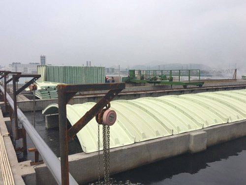 3、轻质高强、安装方便:玻璃钢集气罩比重仅为钢制品的1/3至1/4,固化程度高,载荷负重大,强度高,适用于大跨度池体,同时盖板可分为若干小块,便于运输、安装。